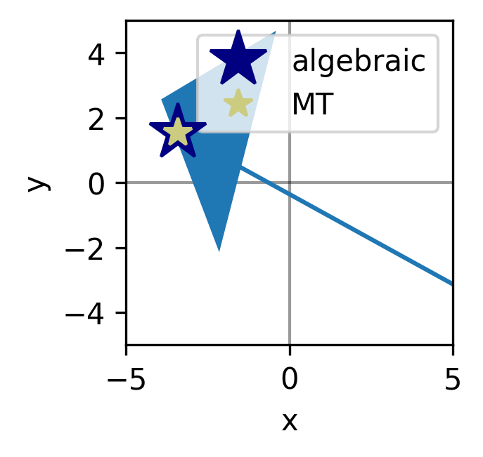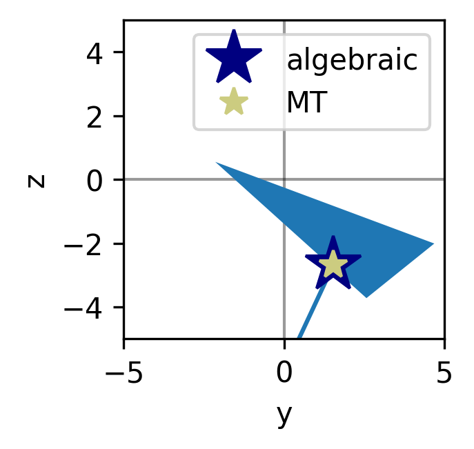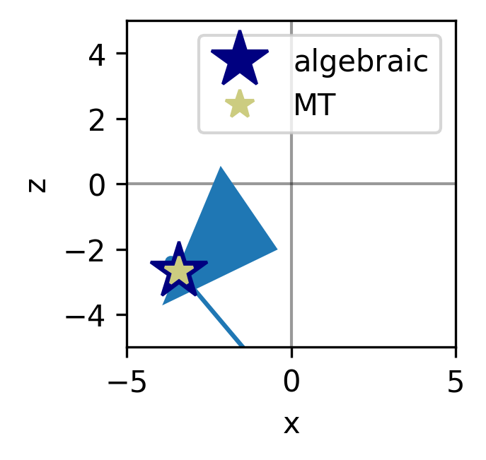 In the same space, we consider a triangle \(T\) defined by the set of three cartesian vectors \(\{ \mathbf{x}_1,\mathbf{x}_2,\mathbf{x}_3\}\). Any point on the plane spanned by the triangle, but contained within the region delimited by the lines \(\{ \mathbf{x}_i,\mathbf{x}_j\}_{i\neq j}\) is an element of \(T\).
